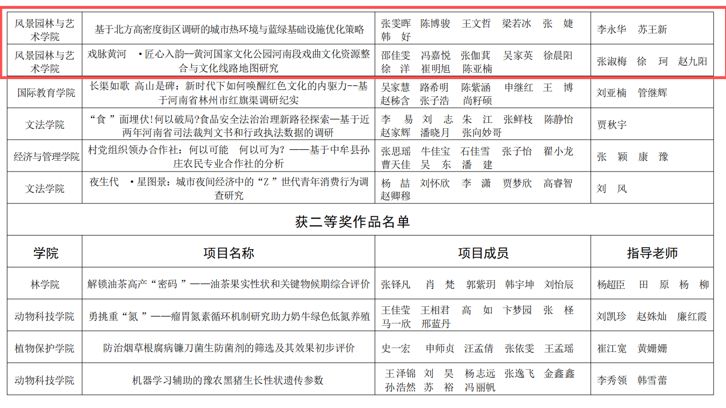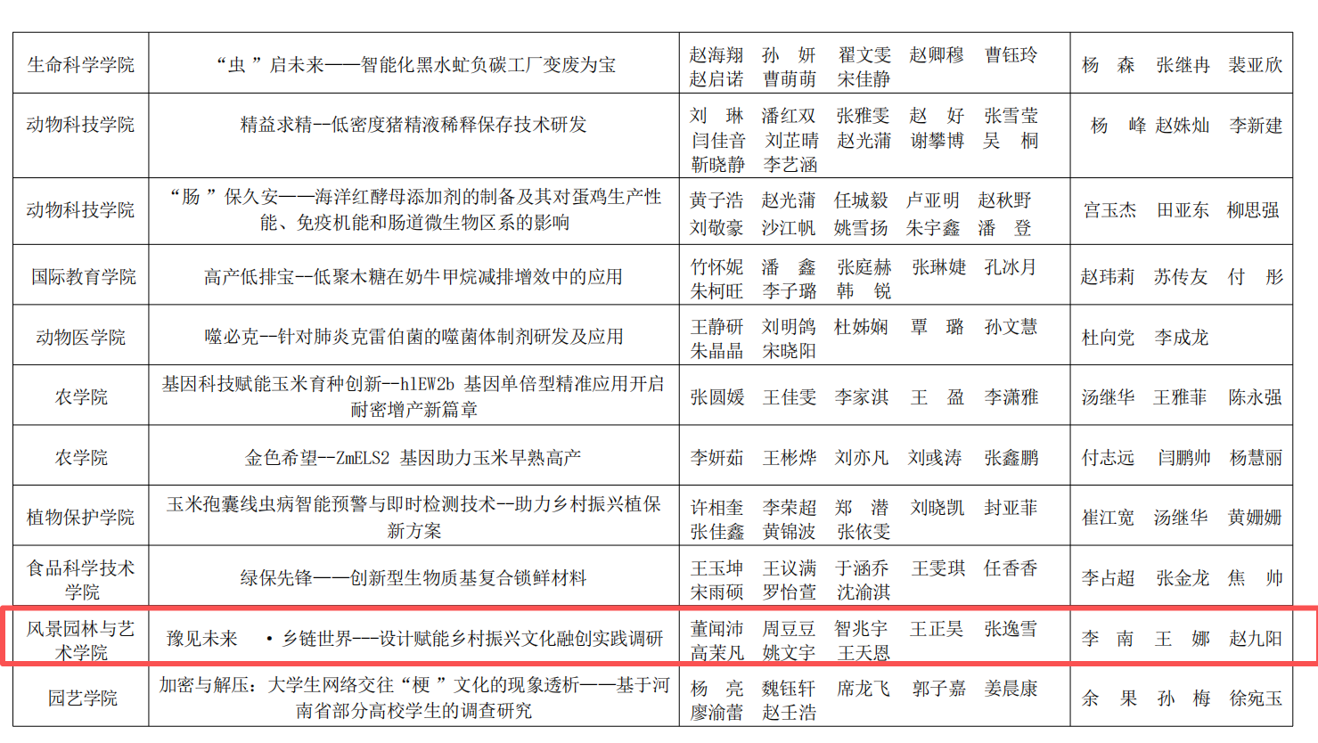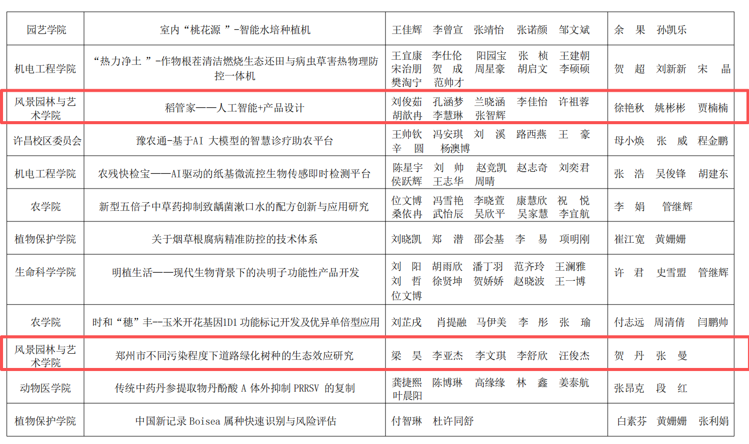 获奖作品中,《豫见未来·乡链世界---设计赋能乡村振兴文化融创实践调研》项目获得特等奖。《有基于北方高密度街区调研的城市热环境与蓝绿基础设施优化策略》《戏脉黄河·匠心入韵--黄河国家文化公园河南段戏曲文化资源整合与文化线路地图研究》两个项目获得一等奖。《稻管家——人工智能+产品设计》《郑州市不同污染程度下道路绿化树种的生态效应研究》两个项目获得二等奖。三等奖作品有《河南省乡村旅游信息服务供需匹配现状及智慧化赋能对策调查研究》《中原民俗文化应用推广研究——以许昌市霍庄村社火文化为例》《台风模拟实验教育展示装置》。每一份荣誉的取得,既离不开指导老师的悉心指导与专业引领,也凝聚着同学们的不懈拼搏与团队协作。这不仅生动展现了我院学子敢闯敢试、勇于创新的青春风貌,更集中体现了学院在强化学生实践能力、深化创新创业教育方面的扎实成效。