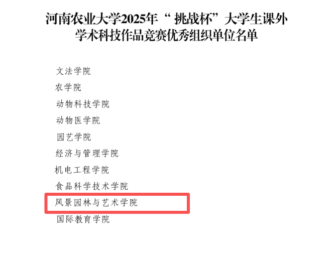 近日,河南农业大学2025年“挑战杯”河南省大学生课外学术科技作品竞赛获奖名单正式公布。经激烈角逐,我院学子凭借过硬专业功底、创新项目设计及优异现场发挥成功突围,斩获颇丰。具体来看,1件作品荣获特等奖,一等奖2项,二等奖2项,三等奖3项,与此同时,我院因组织工作成效显著,被授予优秀组织单位称号。