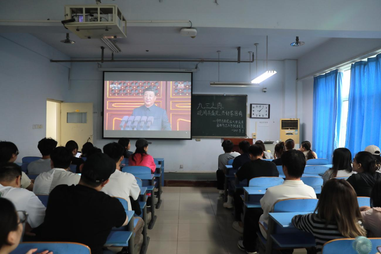 为铭记抗战意义,锚定青年奋斗方向,9月3日上午,我院于文化路校区13号楼第一会议室、推广楼410教室组织师生集中观看纪念中国人民抗日战争暨世界反法西斯战争胜利80周年大会阅兵直播,学院党委书记侯永华、党委副书记赵九阳、副院长阴予兴以及师生代表参加活动。
