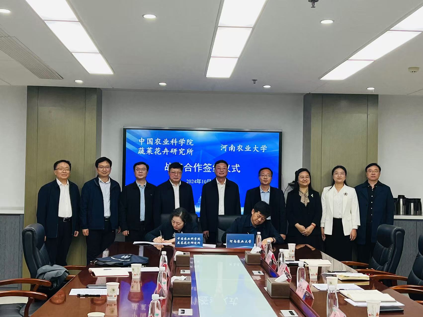 10月30日下午,河南农业大学与中国农业科学院蔬菜花卉研究所战略合作签约仪式在河南农业大学综合楼318会议室举行。校党委副书记何松林、中国农业科学院蔬菜花卉研究所所长张友军出席签约仪式。中国农业科学院蔬菜花卉研究所、学校发展规划处、中国现代农业联合研究生院筹建办、人事处、社会服务处相关负责人、风景园林与艺术学院、园艺学院领导班子及中层干部参加会议。园艺学院党委书记秦素玲主持签约仪式。