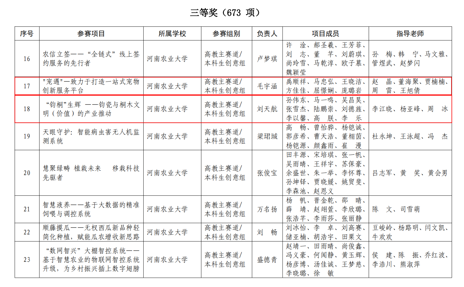 近日,河南省教育厅发布了《河南省教育厅关于2024年河南省大学生创新大赛获奖名单公示的通知》,我院共获得一等奖两项,三等奖两项。其中,《“艺”锦还乡——老家河南乡村品牌蝶变之路》《智建乡村——智能化赋力和美乡村的“一键设计”引擎》两个项目荣获一等奖,《“宠遇”——致力于打造一站式宠物创新服务平台》《“钧桐”生辉——钧瓷与桐木文明(价值)的产业推动》两个项目荣获三等奖。