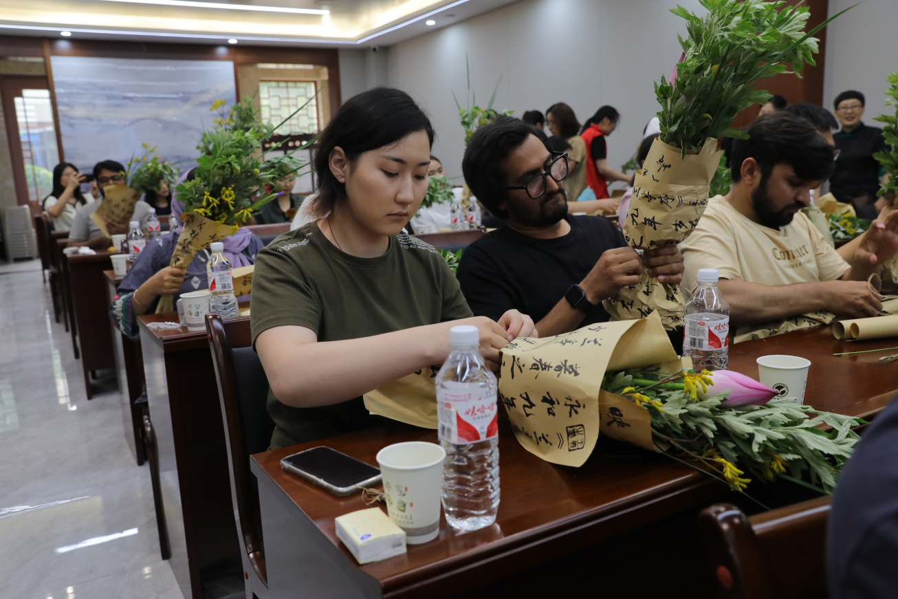 我院教师石力匀讲解了中国的插花文化,并带领留学生制作艾草花束。