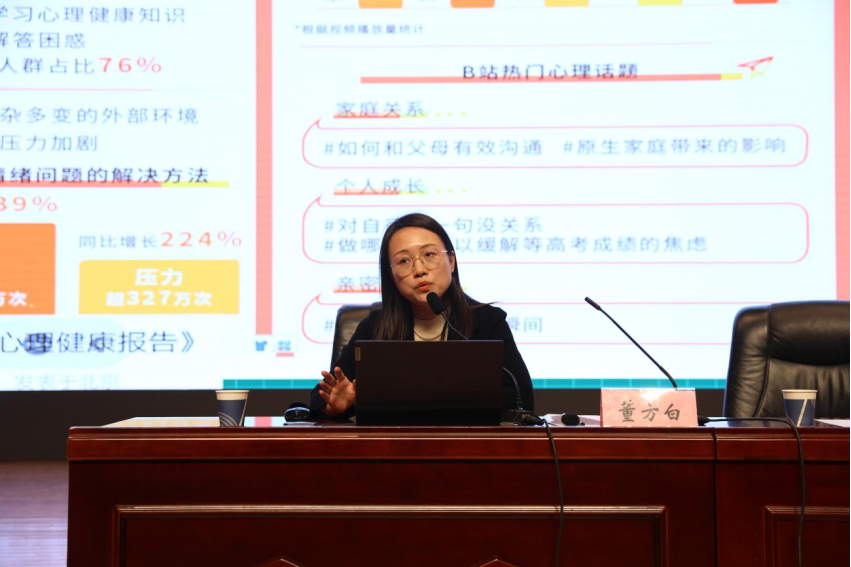 董方白分别从心理疾病种类、发病概率、发病情况、症状初期表现症状等方面向大家科普心理健康知识,通过“乌鸦巫婆”、“天使与恶魔”等互动游戏,指出新生们可能会面临各种压力,包括学业压力、人际关系压力等。并提出了多种压力自我调节方法,强调大学生活要保持乐观的生活态度,多参加各类活动,结交新朋友,提升求助意识,同时也要注意保持良好的作息习惯,保证充足的睡眠,以积极、主动的姿态去解决和排解消极情绪。