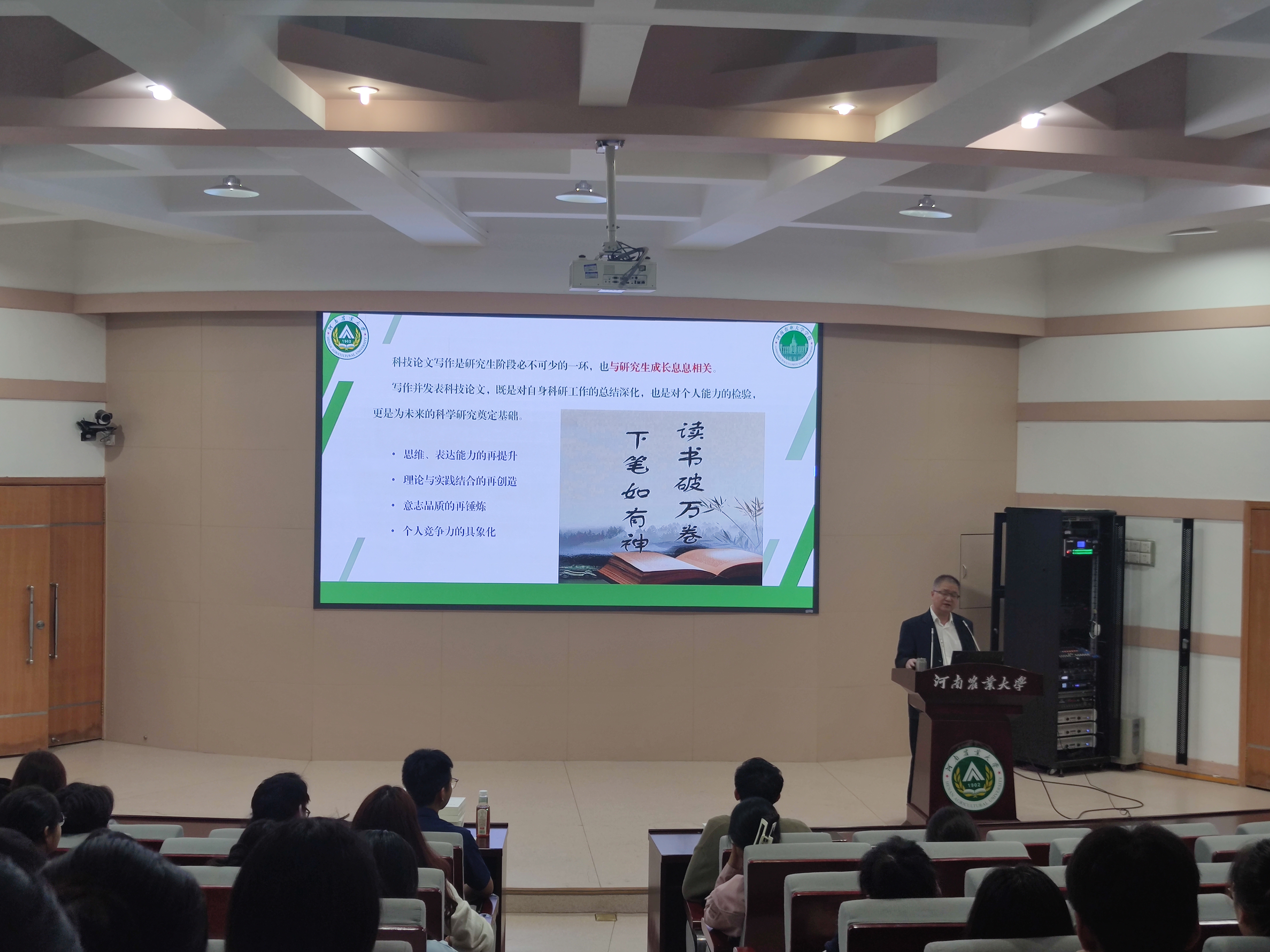 邓俊锋以“助力研究生科技论文写作”为题,围绕科技论文写作要点,论文的写作要求,论文目的及意义,如何做好科研,如何撰写好的论文等方面进行展开讲解。邓俊锋将论文写作与研究生生活相联系,并介绍河南农业大学学报的辉煌历史,对科研、论文写作和投稿等进行了全面剖析,重点讲述了论文的整体布局和构思。他详细介绍了论文的基本构成注意要点和投稿过程中的一些注意事项,使大家对文章从选题论文的写作到投稿到发表的过程有了深刻理解和感悟。