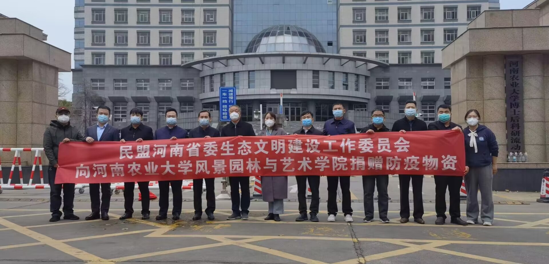 11月12日下午,民盟河南省委生态文明建设工作委员会向我校风景园林与艺术学院捐赠了50箱口罩、400套防护服等防疫物资,捐赠仪式在文化路校区北门举行。民盟河南省生态委员会主任阴三军,我校校友联络办公室主任胡明忠,风景园林与艺术学院院长田国行、副院长阴予兴等相关负责人参加活动。