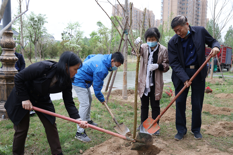 龙子湖校区图书馆前,大家挥锹培土,扶枝入坑,提水浇灌,在欢声笑语中,共同种下了对学校的深情厚谊和美好祝福。待到盛夏校庆日,书香花香相辉映,定会盛放红满堂。