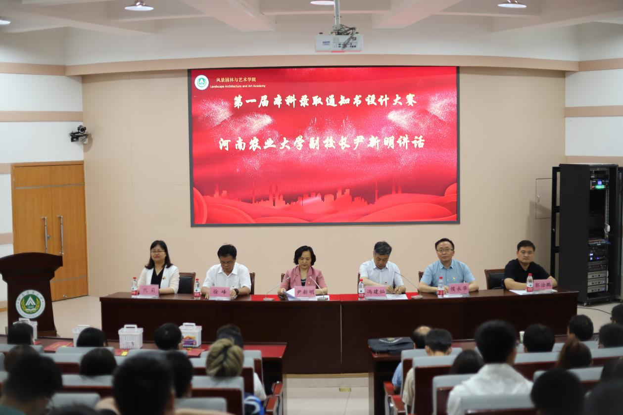 6月17日下午,河南农业大学第一届本科录取通知书设计大赛颁奖大会在文化路校区300人报告厅举行。河南农业大学副校长尹新明,校教务处处长、招生办公室主任冯建灿,校学生处处长、学工部部长徐峰,风景园林与艺术学院党委书记侯永华,校教务处副处长、招生办公室副主任代莉,校学生处副处长、学工部副部长郭治鹏出席大会。大会由冯建灿主持。