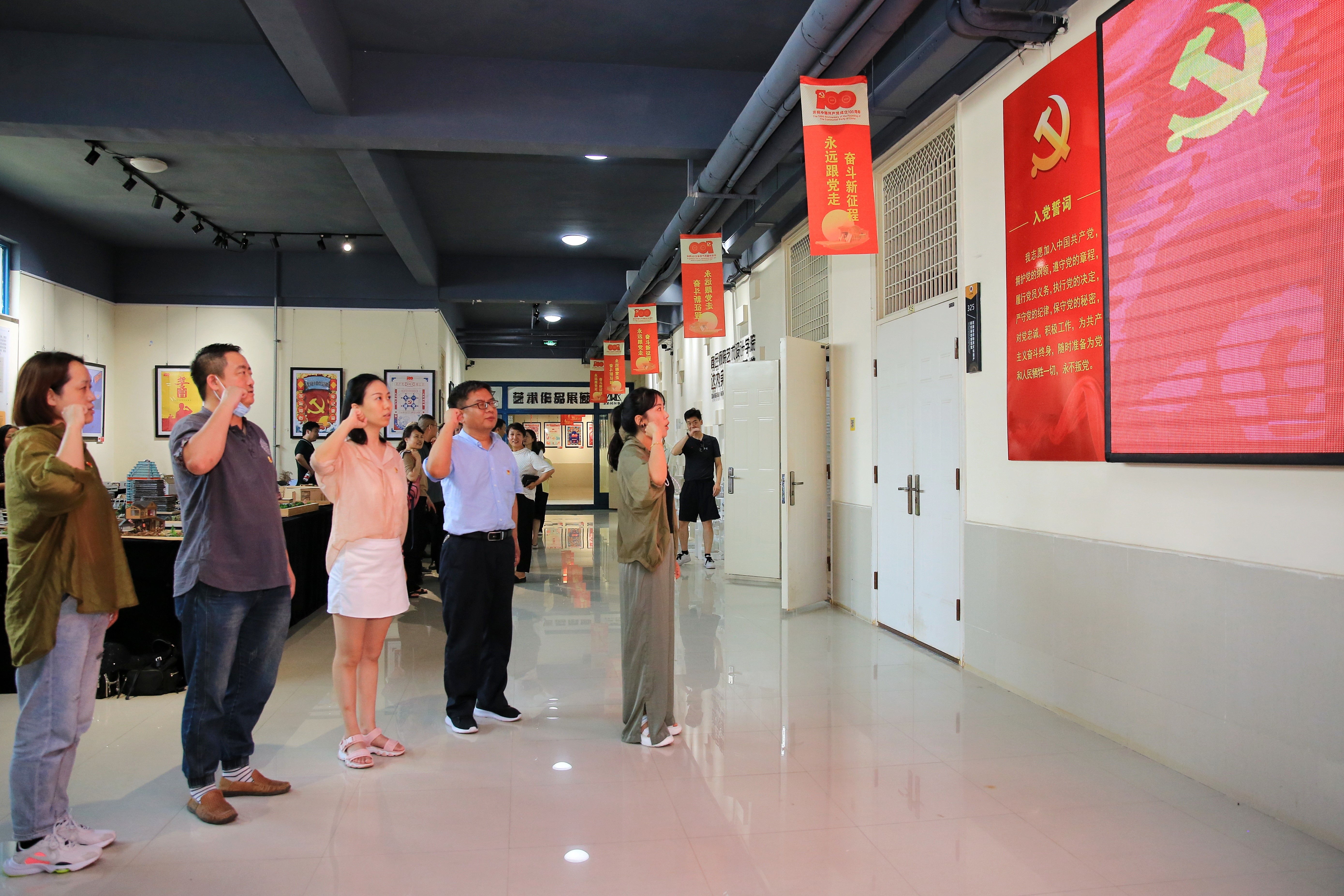 上午在商丘师范学院艺术设计学院党委书记杨莹莹、院长朱长征、副院长苏世昌、任然等的陪同下,观看了商丘师范学院校党史学习教育图片展、艺术设计学院剪纸展、海报展等展览,并参观了艺术设计学院达内实践实训基地、数字创意研发服务中心、动漫研发中心、商业摄影实验室等校内实训场所。随后,在展厅外的党旗下,艺术系全体党员同志举行了重温入党誓词的党日活动。座谈会上,副校长程功鹏,代表商丘师范学院对阴予兴一行表示热烈的欢迎,并重温了两校开展的友好合作与交流历史。随后双方就应用型本科专业人才培养方案修订、课程思政建设、本科教学评估、实践教学、社会服务、硕士生联合培养等相关工作进行了深入交流和探讨。这必将进一步加强和促进双方在艺术设计领域教育教学改革发展的合作与交流。