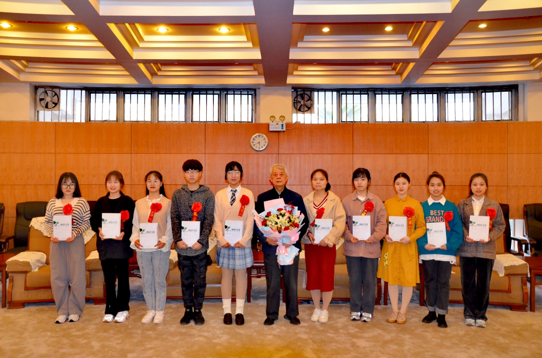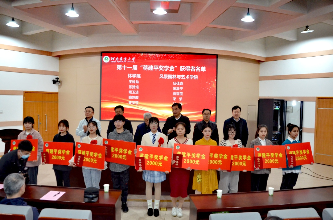 侯永华宣读了《河南农业大学林学院、风景园林与艺术学院关于表彰第十一届“蒋建平奖学金”获得者的决定》。随后,与会领导一同为10名第十一届“蒋建平奖学金”获得者颁发获奖证书及奖学金。