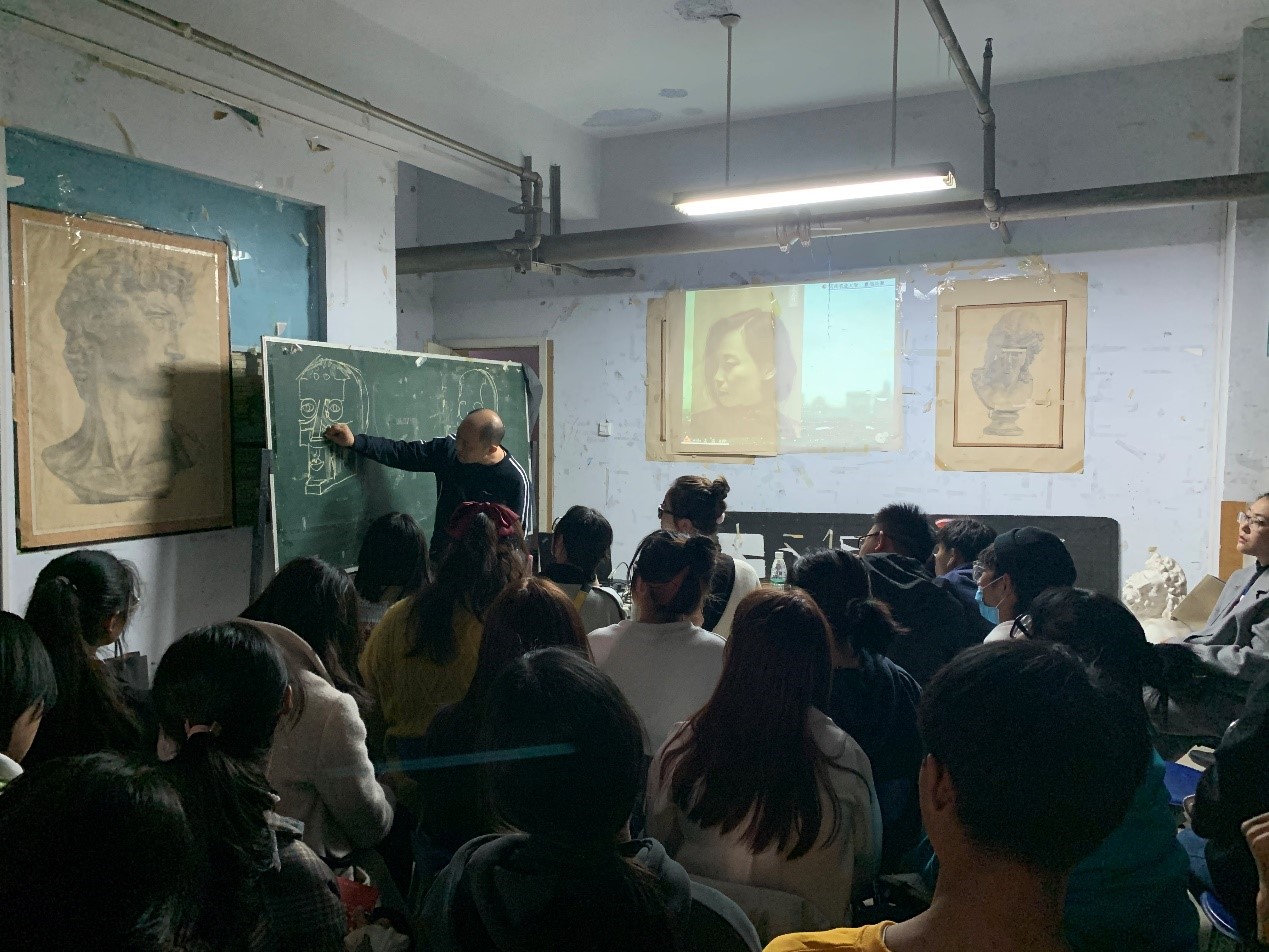 观摩课上,孟滨为大家讲授了素描人物头像写生基础。将理论知识与大师作品相结合,详细讲述了素描头像的观察方法,整体观念以及立体观念。通过对头部结构的示范绘画和体块化的分析,讲解了人体头部骨骼及肌肉的绘画方法。课堂上孟滨现场与同学们热情互动,讲解深入浅出,语言生动幽默,气氛轻松活跃。最后孟滨以学生为模特示范了头部素描的绘画过程。