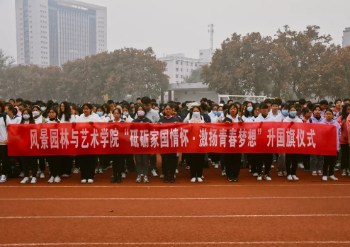 7时整,升旗仪式正式开始。国旗护卫队迎着朝阳、踏着铿锵有力的步伐迈向升旗台,全体师生庄严肃立,向国旗行注目礼,在激昂的《义勇军进行曲》中,鲜艳的五星红旗迎风招展、冉冉升起。院党委书记侯永华发表讲话,他强调,回顾历史长河,无数英雄为中华民族伟大复兴而慷慨就义,以生命为代价,换来中华儿女今天的美好生活。处在中国特色社会主义新时代中,站在“十四五”新的历史起点上,全体景艺人应精神抖擞、整装待发,势必以全新的面貌、昂扬的姿态迎接新的困难、攻破新的挑战,展现出风景园林与艺术学院的风采,为学院发展创造出新的奇迹。随后,学生代表2019级环境设计1班王晨光同学,作为一名在校参军入伍的大学生,作为新时代的青年,他表示景艺人应该树立远大的理想,立鸿鹄之志,坚定信念,不断开拓进取,补足精神之“钙”,为祖国更美好的明天而奋斗,把握现在,展望未来。最后全体师生合唱《红旗飘飘》。