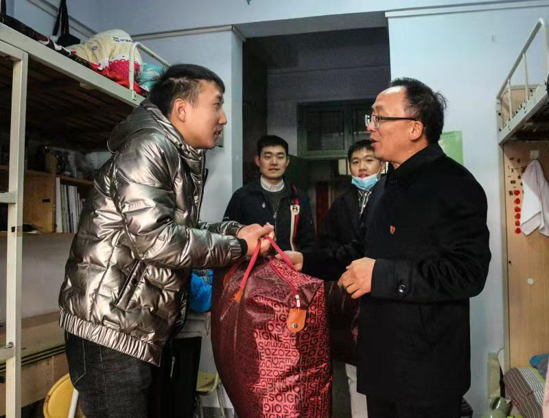 活动中,学院领导班子深入3号楼、5号楼、6号楼学生宿舍,为学生送上御寒棉被,让学生在这个冬季感受到来自学院的殷殷关切。每到一间宿舍,学院领导和老师察看学生住宿环境,仔细检查宿舍基础设施,与学生亲切交谈,进一步传达党的十九届五中全会精神,勉励广大学生坚定理想信念,脚踏实地,刻苦学习专业知识,不负宝贵时光。对来自省外的学生,学院领导和老师关怀地问道“适不适应郑州的气候”、“适不适应河南的生活”等等,贴心询问其学习生活方面存在的实际困难,嘱咐年纪辅导员老师多关心关注他们的生活学习,及时提供必要的帮助,并鼓励学生提高自身素质,锻炼过硬本领,早日成长为社会主义合格建设者和可靠接班人。受助学生纷纷表示被学院的关心与关怀所感动,要将这份温暖化作奋斗的动力,认真学习科学文化知识,真正成为“有理想、有本领、有担当”的新时代青年。