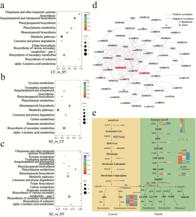 课题组进一步聚焦萜类物质合成通路,鉴定出52个萜类合酶(TPS)基因,分为六个亚家族,其中TPS-b、TPS-f和TPS-g亚家族显著扩张。通过转录组与代谢组联合分析,揭示了43个差异表达基因与117种萜类化合物的合成密切相关,其中LmTPS1基因与石竹烯氧化物含量高度相关(图3),为我们理解萜类化合物的生物合成途径提供了新视角。