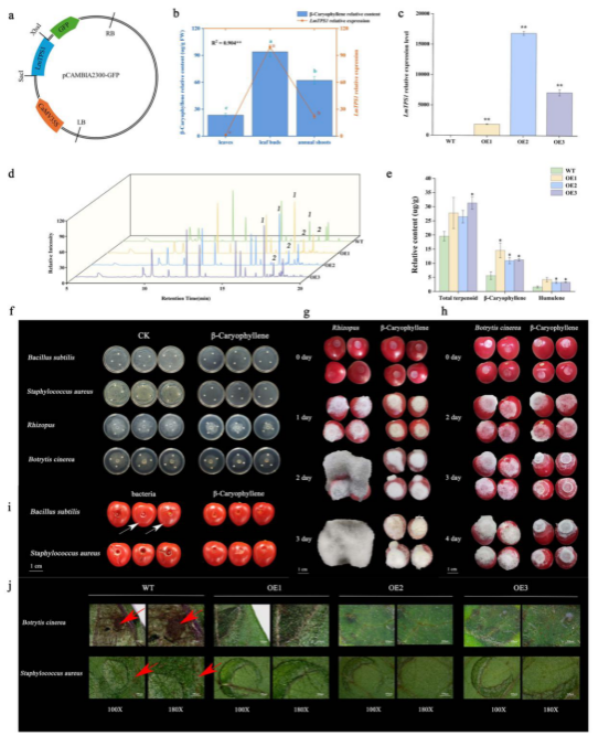 值得关注的是,课题组发现黑壳楠叶片挥发物对多种真菌和细菌具有显著的抑制作用,过表达LmTPS1的转基因番茄中β-石竹烯和蛇麻烯含量显著升高,灰霉菌和金黄色葡萄球菌抗性明显增强(图4)。这一发现不仅为利用萜类化合物开发天然抗菌剂和抗病分子育种提供了关键靶标,还为其在农业和园林康养领域的潜在应用提供了有力支撑。