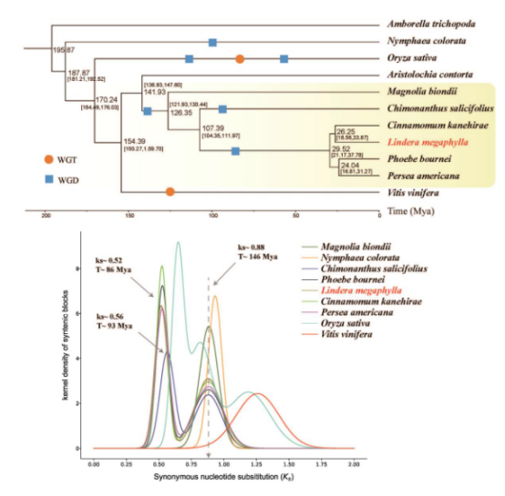 通过与15个代表性物种的基因家族进行比较分析,黑壳楠中存在13,675个基因家族。黑壳楠基因家族扩张与收缩情况与其他物种存在显著差异,能量代谢和细胞生长密切相关的基因家族出现明显扩张,碳水化合物代谢和信号转导相关基因家族则呈现出收缩趋势。进化分析表明,黑壳楠在演化过程中经历了两次全基因组复制事件(WGD),分别发生于约1.46亿年和8600万年前(图2)。这为其基因组的多样性和复杂性提供了合理解释。