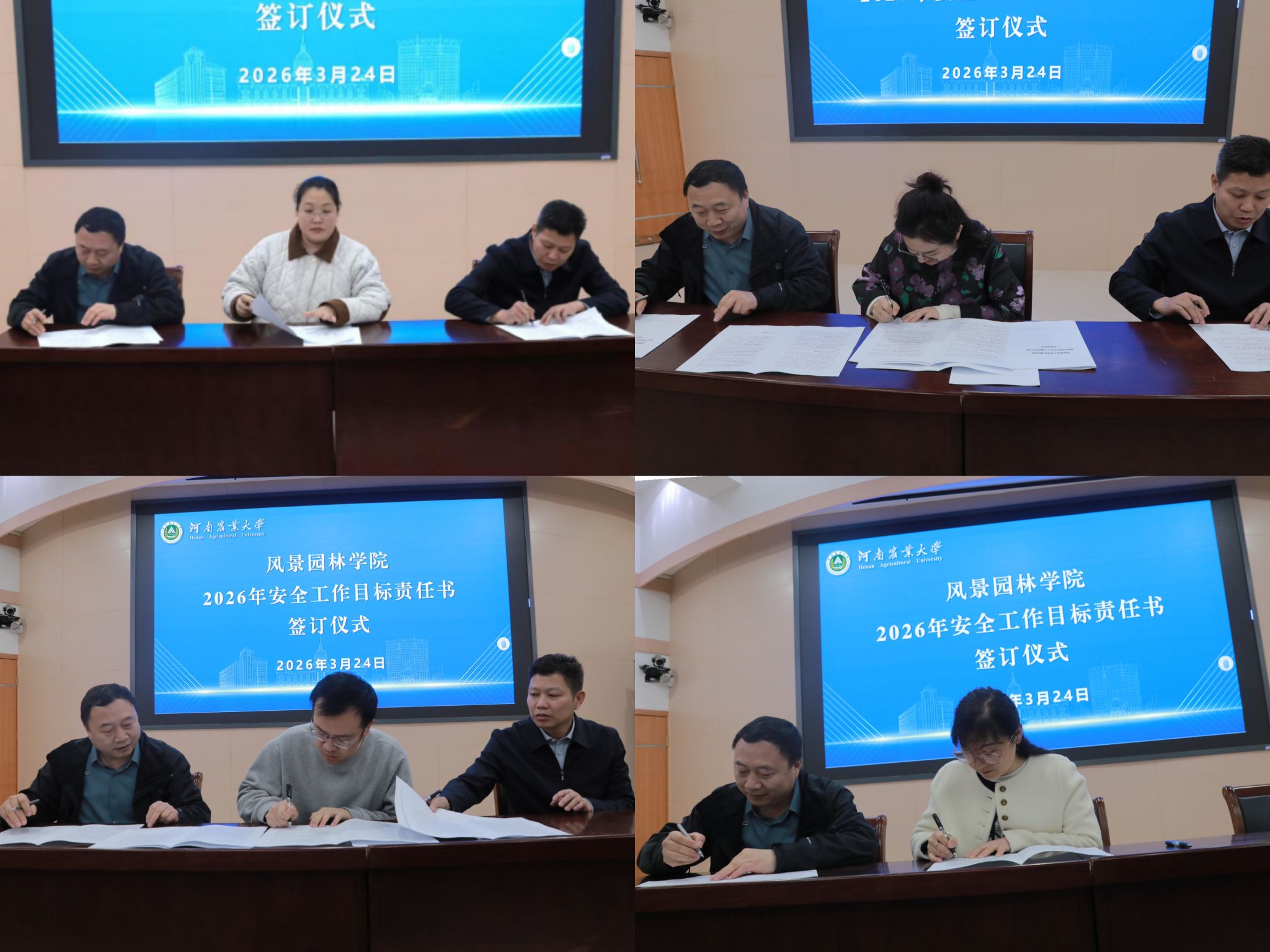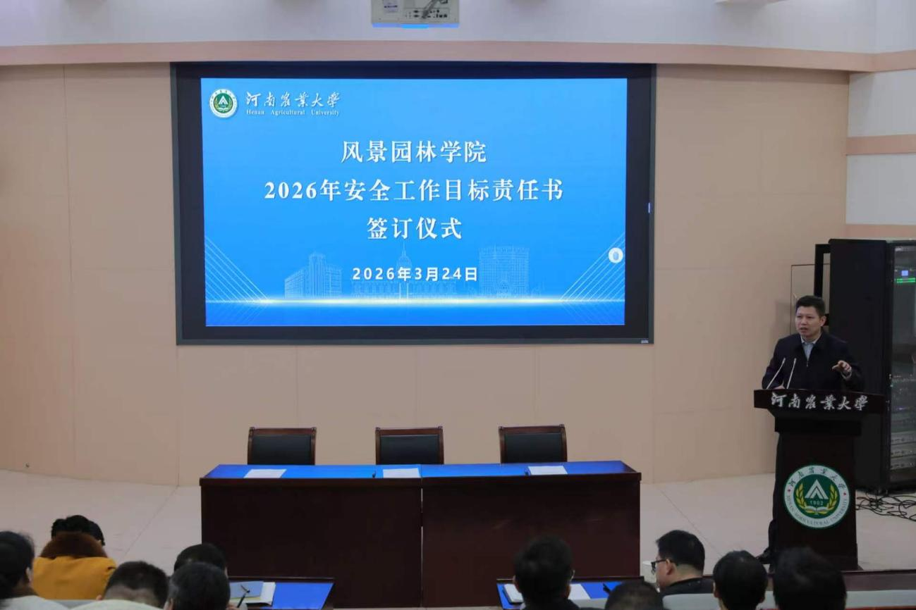 责任书签订环节中,胡明忠、院长李永华代表学院与各系室负责人签订《河南农业大学风景园林学院2026年度安全生产、消防安全工作目标责任书》《河南农业大学风景园林学院2026年度校园安全稳定与治安综合治理目标责任书》。李永华代表学院与中心实验室主任专项签订《风景园林学院实验室安全目标责任书》。各实验室负责人签订《风景园林学院实验室安全责任书》。此次责任书签订以书面形式明晰了各系室、各岗位的安全工作职责清单、目标任务和追责机制,实现安全管理全覆盖、无死角。