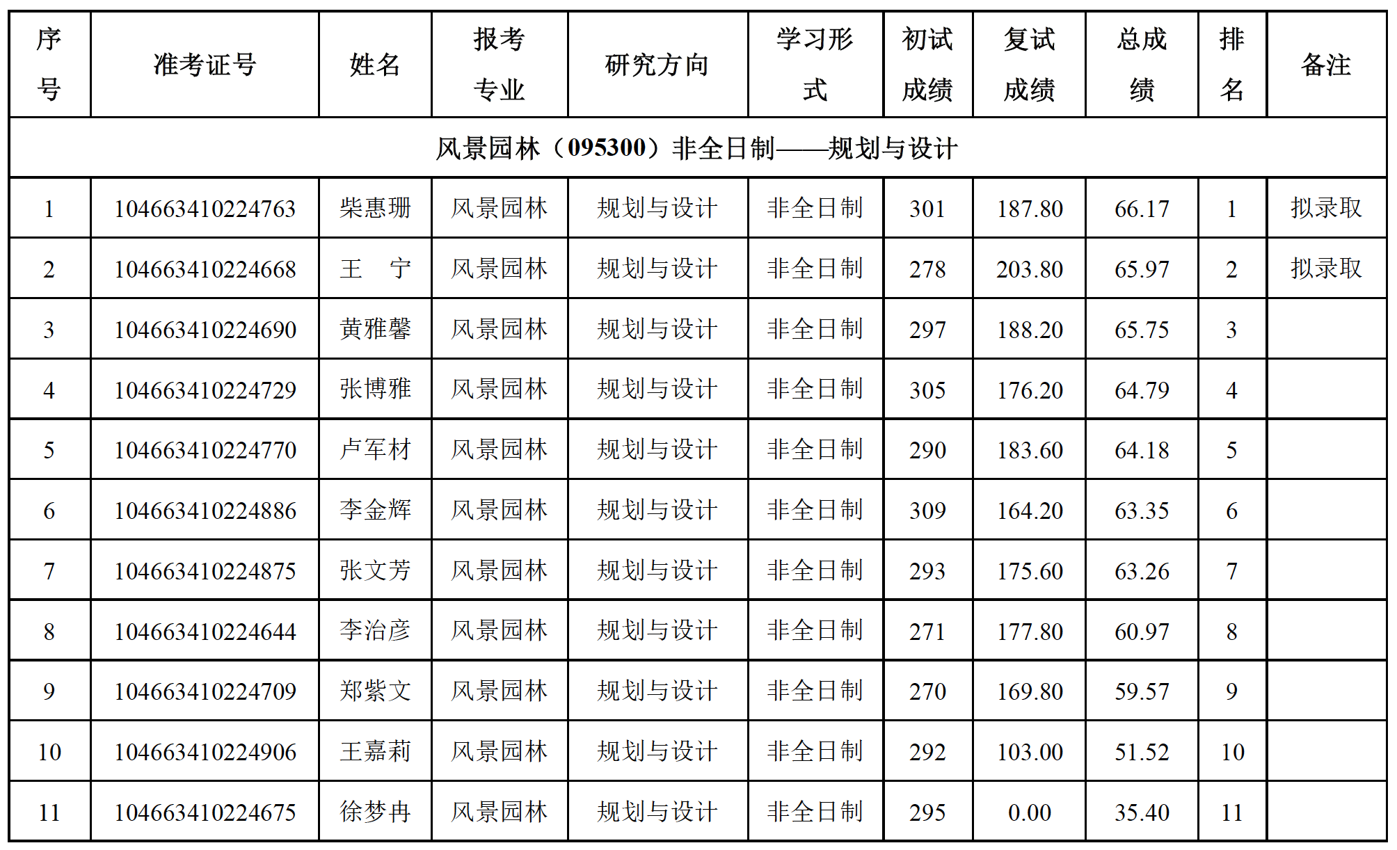 根据我校硕士研究生复试录取工作政策调整及我院复试、第一批调剂的具体情况,风景园林专业(095300)非全日制规划与设计方向新增2个招生计划数,依据复试总成绩及自愿调剂排名结果公示如下: