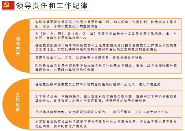 第四十一条 各级党组织对发展党员工作中出现的违纪违规问题和不正之风,应当严肃查处。对不坚持标准、不履行程序、超过审批时限和培养考察失职、审查把关不严的党组织及其负责人、直接责任人应当进行批评教育,情节严重的给予纪律处分。典型案例应当及时通报,对违反规定吸收入党的,一律不予承认,并在支部大会上公布。