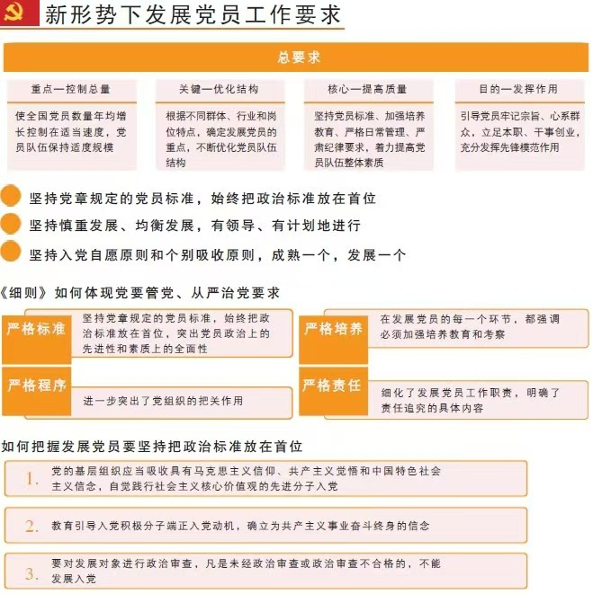 第三条 发展党员工作应当贯彻党的基本理论、基本路线、基本纲领、基本经验、基本要求,按照控制总量、优化结构、提高质量、发挥作用的总要求,坚持党章规定的党员标准,始终把政治标准放在首位;坚持慎重发展、均衡发展,有领导、有计划地进行;坚持入党自愿原则和个别吸收原则,成熟一个,发展一个。