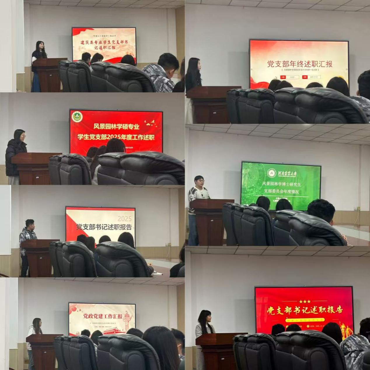 12月23日,风景园林学院2025年度学生党支部书记述职评议大会在文化路校区13号楼第一会议室召开。学院党委副书记赵九阳、正科级组织员李雨澍、团委老师蔚洪波、研究生辅导员韩平阳及各学生党支部书记、负责人、支委和各支部党员代表参加会议。