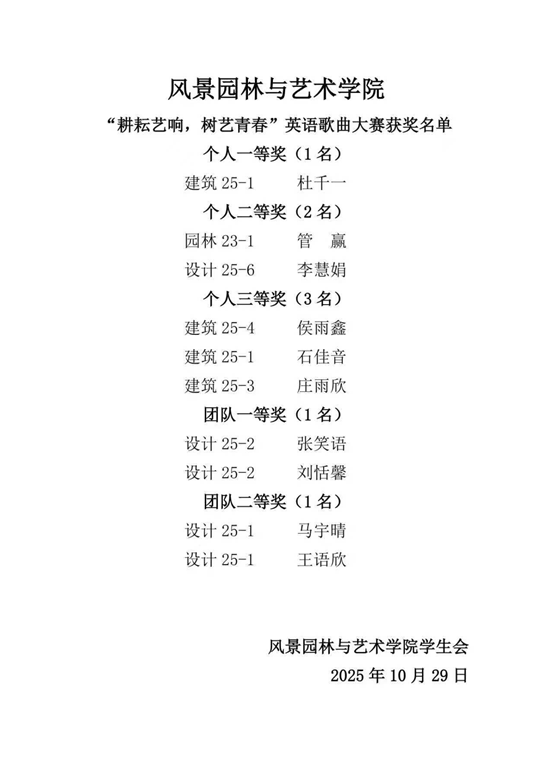 以下是本次英语歌曲大赛的获奖名单: