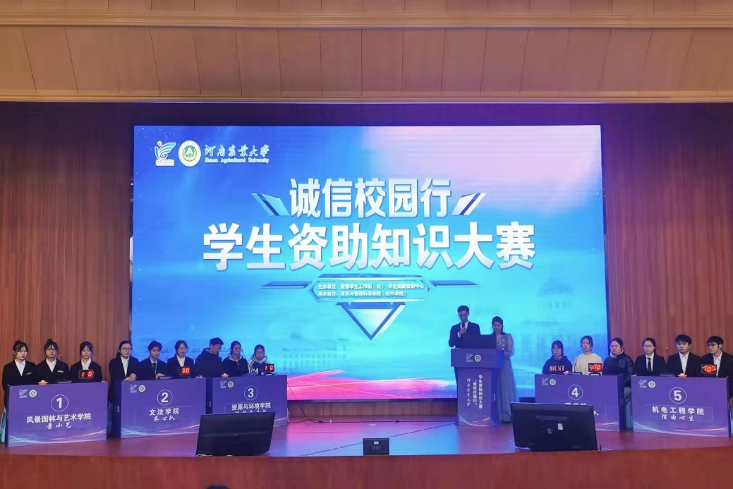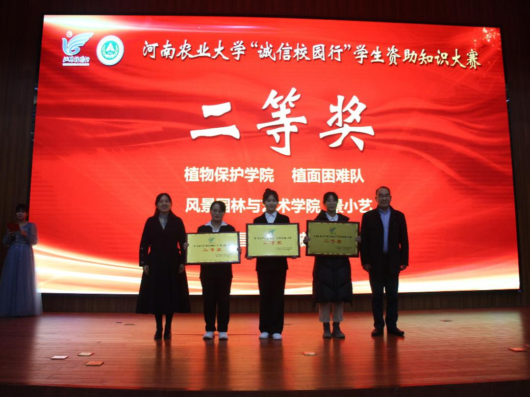 12月7日,由校学生处学生奖励资助中心主办的河南农业大学“诚信校园行”学生资助知识大赛在龙子湖校区图书馆报告厅隆重举行。二十个学院同台竞技,我院参赛队伍经过层层角逐,以总积分第四名在此次大赛中荣获二等奖,学院荣获优秀组织奖,1人荣获优秀指导老师,郝戴祎、王喆、张媛媛等三名同学荣获优秀选手。