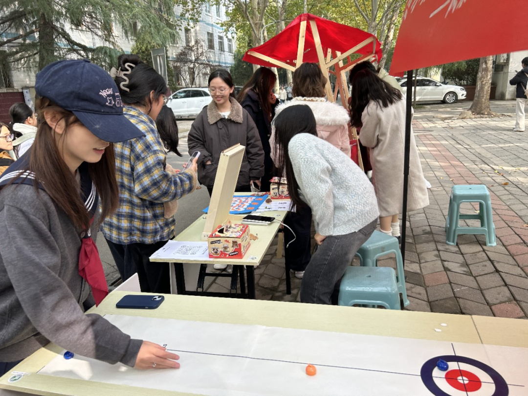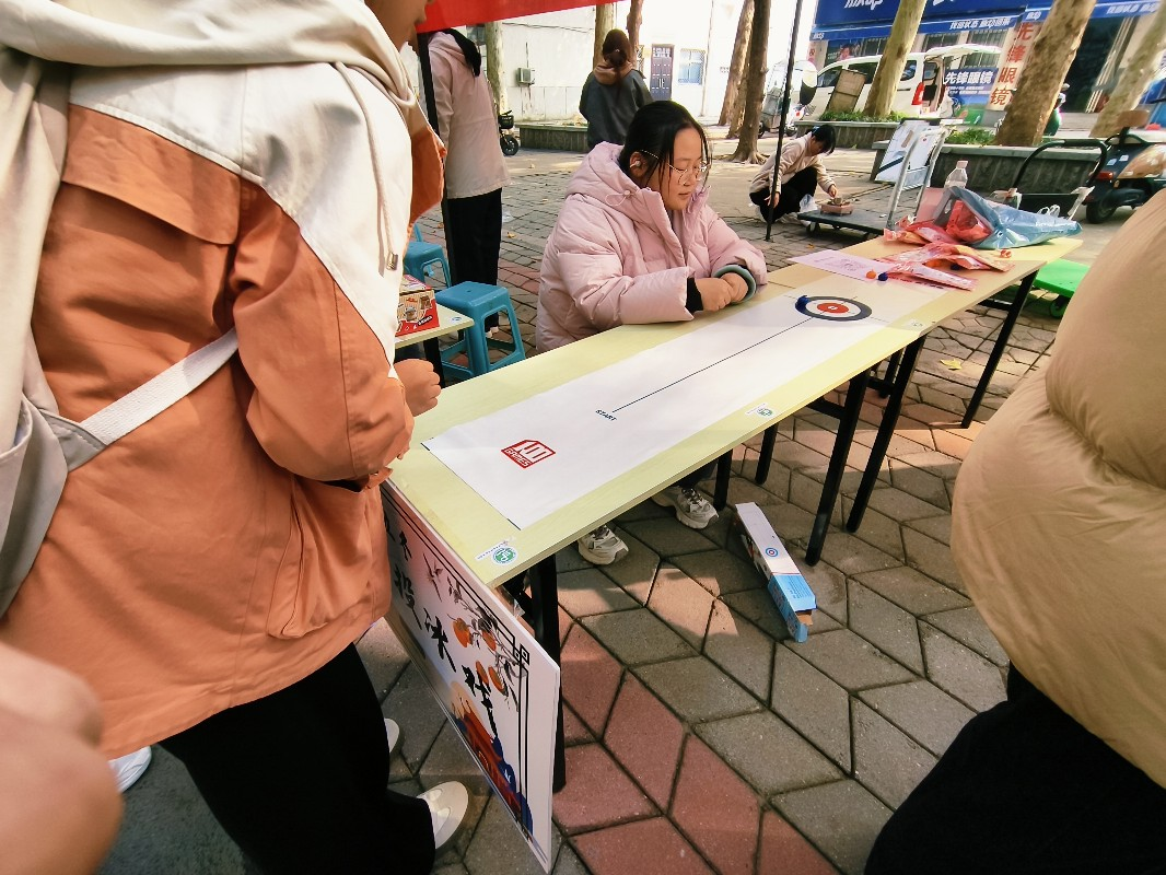 在“始终投冰戏”的游戏现场,热闹非凡。随着一声令下,同学们纷纷在方寸桌面上专注且认真的操控着冰壶,这时候一个个冰壶在桌面上缓缓的滑动,你追我赶同学们的心也跟着紧张了起来。冰壶慢慢滑向目标,输赢已经不重要,大家一起欢呼的感觉才最棒。
