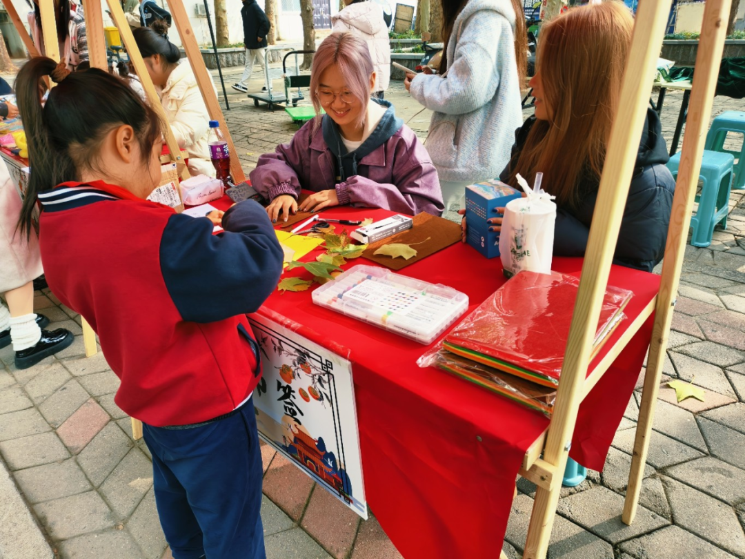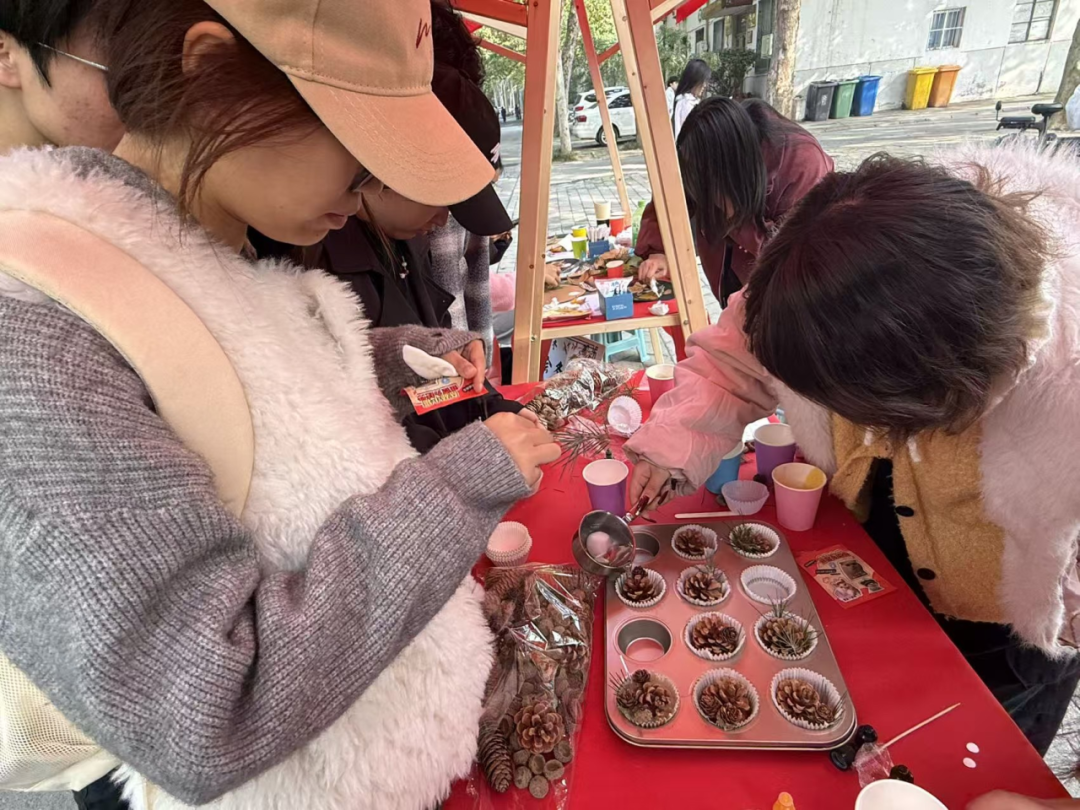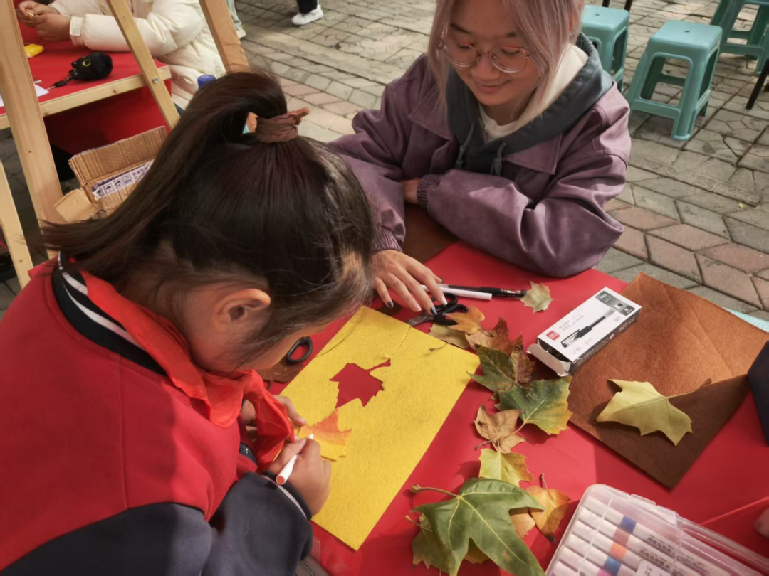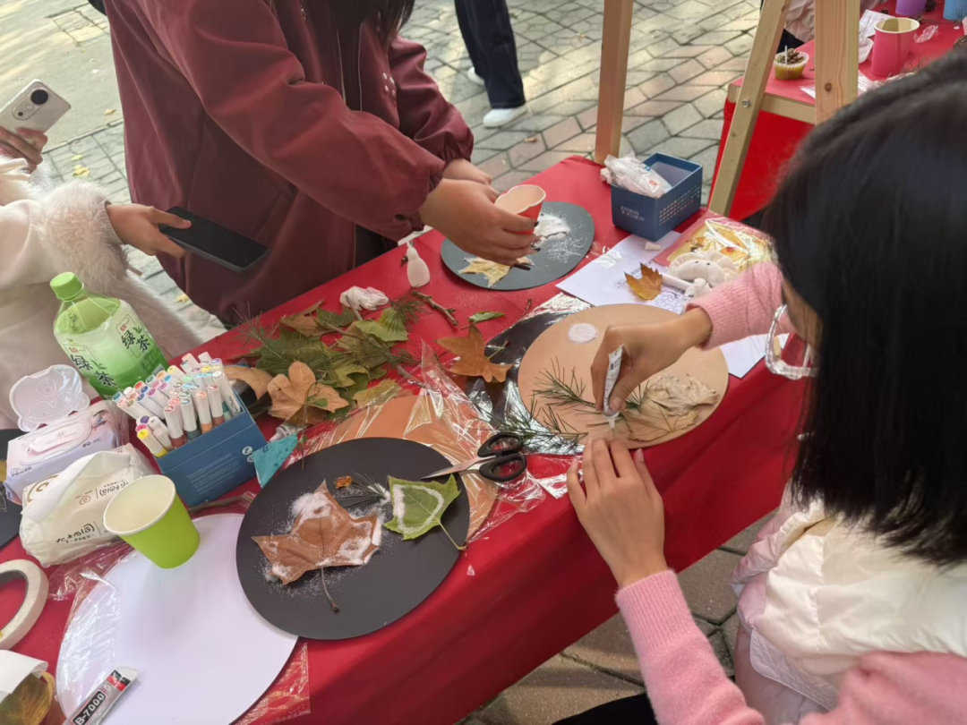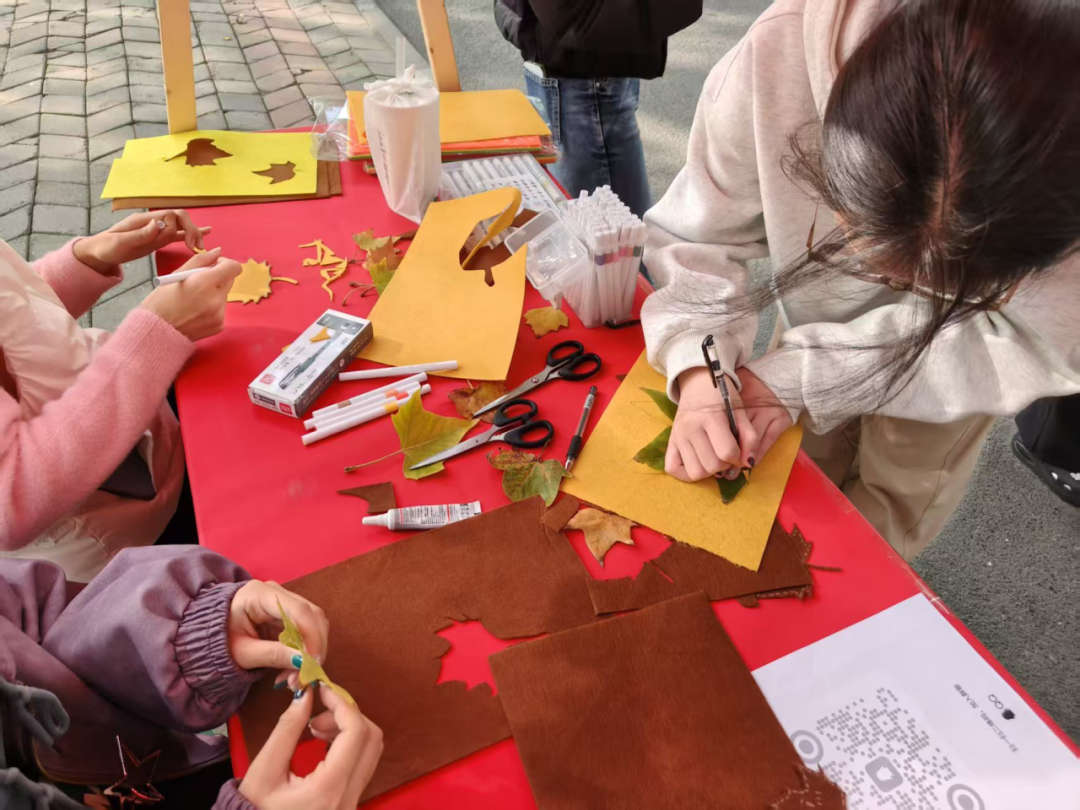 在 “ 冬叶布签 ” 的活动现场,同学们正埋头专注地制作。指尖翻飞,用不织布剪出叶子的形状,再一针一线耐心拼接粘贴。即便是零基础也能轻松上手,完成这份独属秋冬的治愈小手工。生动的叶片书签,仿佛把易逝的秋天永远留在了书本间,每次翻页都是与自然的重逢。