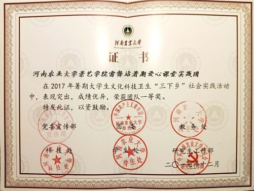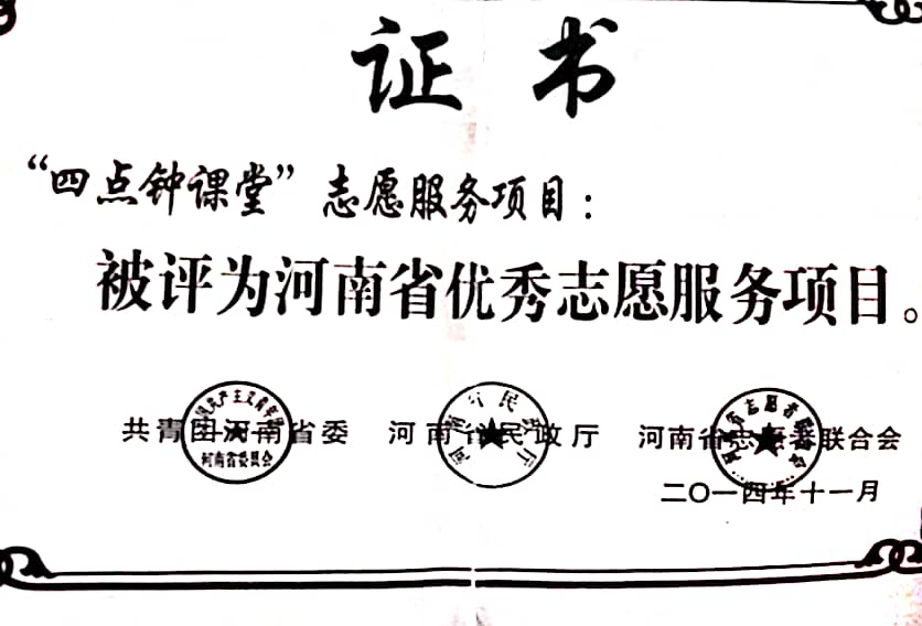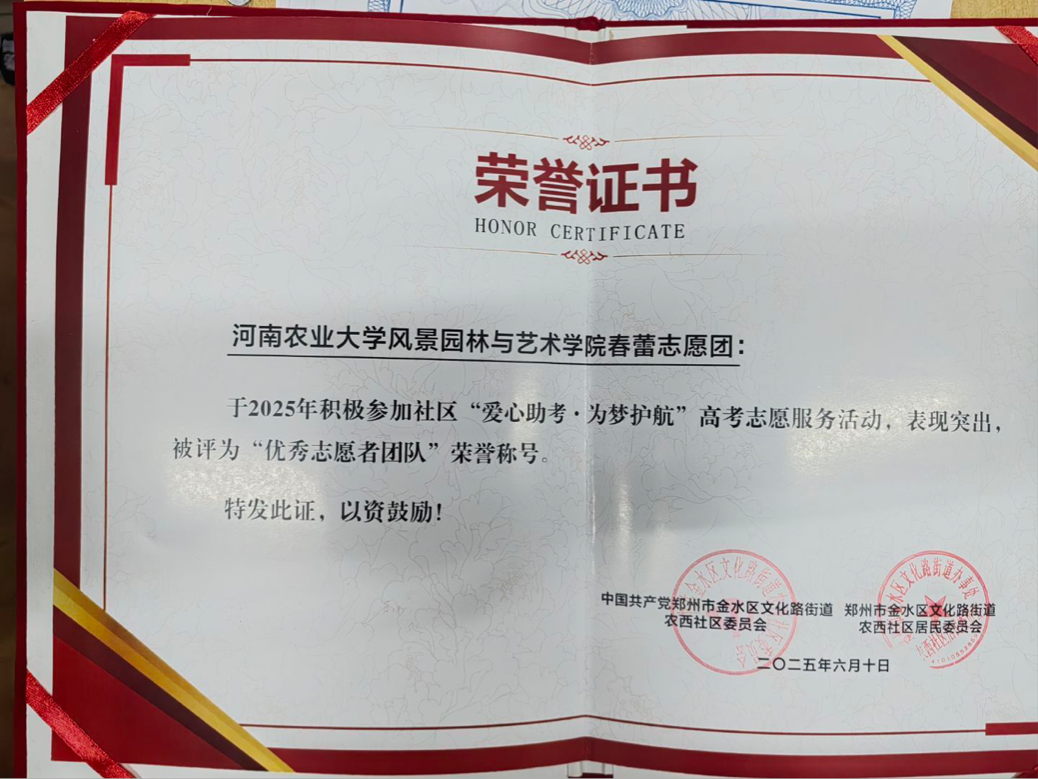 荣誉墙上,累累硕果见证初心:团队先后斩获“2019年七彩假期志愿服务项目示范团队”、志愿服务团体“爱心联盟”评选的年度优秀大学生志愿服务团队、“携手共建幸福河”志愿服务项目十佳志愿服务组织、“2022年第六届中国青年志愿服务项目大赛铜奖”、“希望工程激励行动激励成果奖”等多项重磅荣誉;同时还荣获“五星志愿服务团队”“第十届郑州市优秀青年志愿者服务集体”“稻草人杯优秀志愿服务集体”“2014-2015年度金水区十佳志愿服务团体”“2015年度河南省百佳大学生社会实践团体”等称号,连续多年获评“河南农业大学优秀志愿组织”“河南农业大学志愿服务先进团队”。此外,团队还收获“社区优秀志愿者团队”“优秀集体”“三下乡优秀队伍”“黄河马拉松赛志愿者团队证书”等认可,相关事迹被河南日报、大河报、郑州电视台等主流媒体广泛报道。