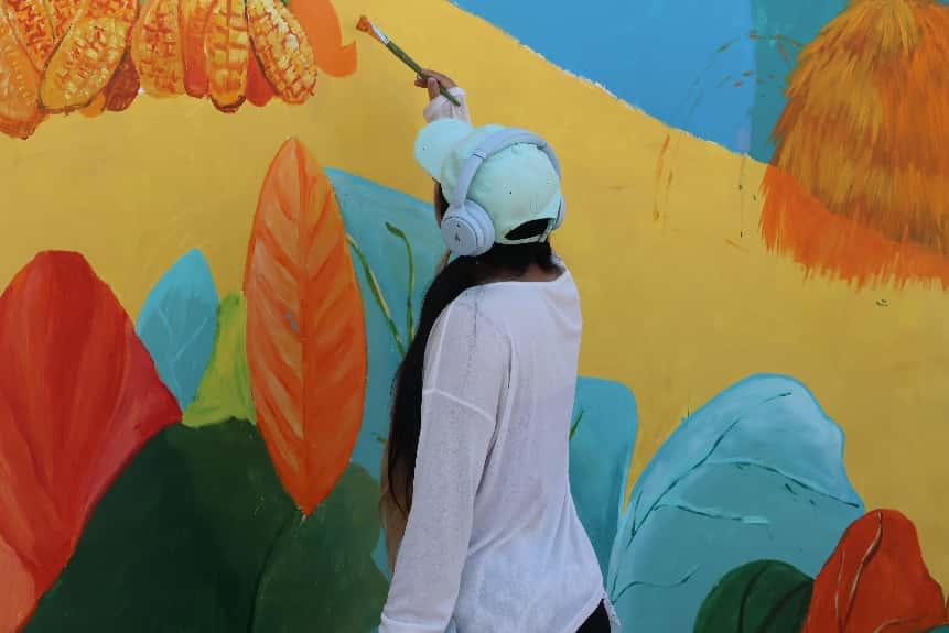 绘有玉米的墙段,成员们以极细勾线笔,复刻玉米的参差形态,用渐变色彩模拟阳光洒在玉米上的明暗层次;人物描绘时,捕捉村民笑纹的舒展弧度、孩童奔跑时衣摆的动态褶皱使原本稍显平面的墙绘场景,蜕变为立体鲜活的乡土艺术长卷。这些从田野里“挖”出的素材,正成为墙绘艺术深化的灵感富矿,让后续创作精准契入乡村文化脉络。