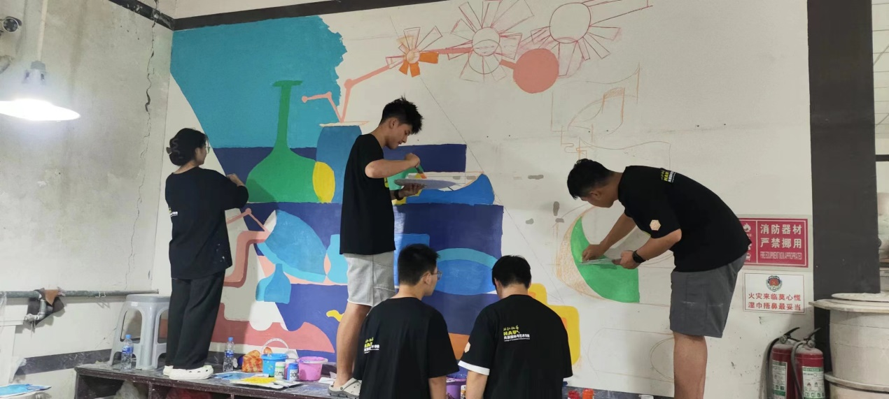 经过一天的辛勤努力,乡村艺绘队的成员基本完成了两幅墙面的绘制工作,这些墙面丰富了工作室室内环境的色彩构成,同时抽象的画法也为绞胎瓷的在色彩,形状,纹理等方面的创新提供了新的思路。在接下来的社会实践中,我院墙绘队将为绞胎瓷的非遗文化传播与发扬做出贡献,为乡村振兴添“油”加“彩”。