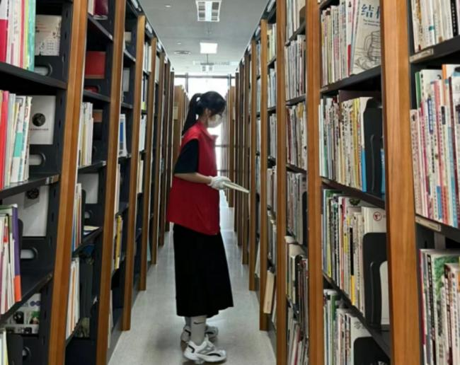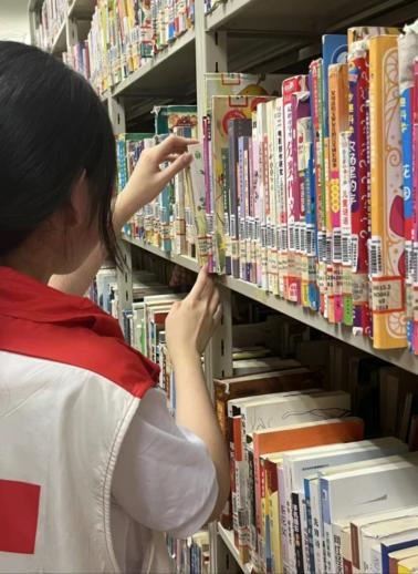 本次活动主题为“花开半夏,阅微圣光”,社区服务队成员积极响应,参加活动。安静的图书馆里,穿梭着一道道忙碌的身影。志愿者们身穿红色马甲,认真擦拭每一张书桌。团队成员对书刊进行分类、编制书目索引,了解书籍的主要内容,帮助读者快速找到想要的书籍类型,指引读者进行借书还书,维持了良好的读书环境。