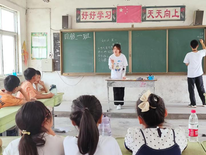 早上,实践团队成员与孩子们一起进行晨读,带领孩子学习中国古诗词文化。随后,团队成员为他们开展了英语、舞蹈、科学实验等趣味课程,独特幽默的教学方式引起孩子们的学习兴趣,通过课程,孩子们收获了很多文化知识。课堂上,团队成员与孩子们相互问答,欢声笑语不断。