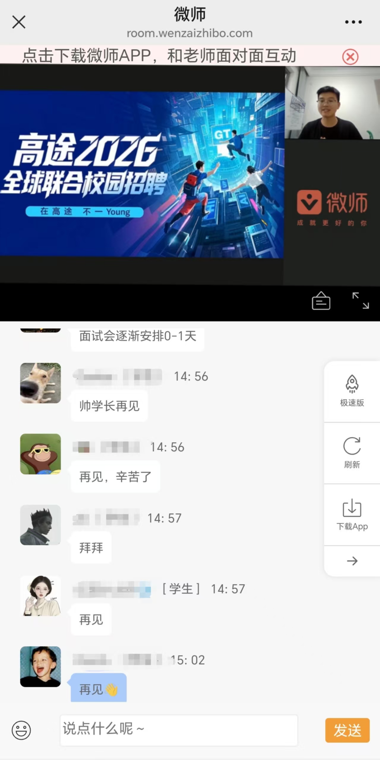 为助力我校学生把握就业机会,搭建学生与企业间的高效沟通桥梁,9月11日,高途集团2026秋季校招线上宣讲会借助微师平台顺利开展,我校众多怀揣求职憧憬的学子积极参与其中,线上互动氛围十分热烈。
