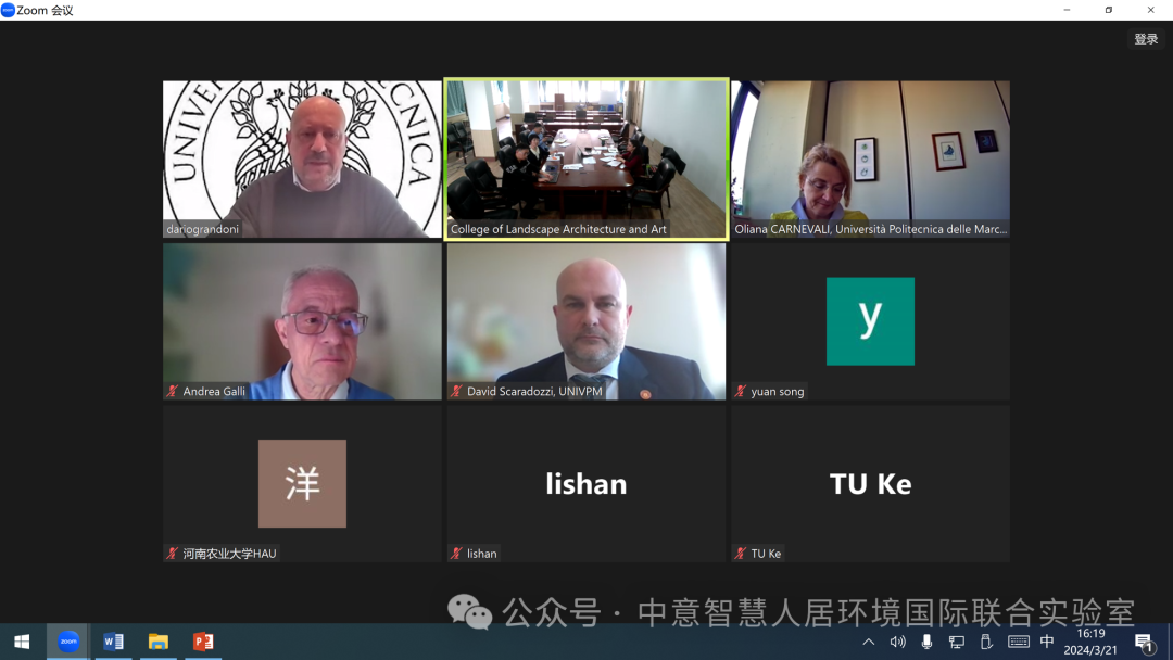 3月21日下午,我院与意大利马尔凯理工大学代表召开中意智慧人居环境国际联合实验室在线工作会议,讨论下一步国际合作交流问题。我方河南农业大学国际合作与交流处处长屠克,风景园林与艺术学院院长田国行教授、副院长李永华教授,国际合作与交流处留学生科科长刘洋,河南省风景园林国际联合实验室成员蒋鹤、李华威,艺术系教授李山及意大利语中心教师Carmen Gaeta出席,意方马尔凯理工大学经济学院Dario Grandoni教授、CIRP实验室负责人Andrea Galli教授、农林食品学院院长Davide Neri教授、科学院Oliana Carnevali教授(兼国际处)、工程学院David Scaradozzi教授及马尔凯理工对外合作代表宋元通过Zoom出席了会议,会议由田国行院长主持。