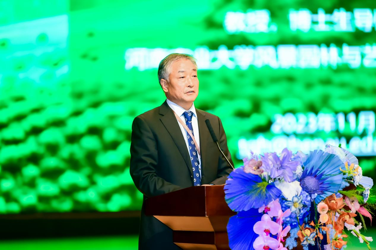 介晓磊代表学校致辞。他首先对各位嘉宾的莅临表示欢迎,并简要介绍了河南农业大学的发展史。他指出,风景园林发展对于支撑美丽中国建设具有突出作用,培养一大批创新型复合型应用人才,是所有风景园林教育工作者和行业从业者的重要使命和历史责任。近年来,河南农业大学积极探索、坚持走好产教融合科教融汇发展道路,组建团队、搭建平台、承担项目、创新服务,形成了多个优势的研究领域和方向,为河南省乃至全国风景园林行业输送了一大批优秀人才,为地方生态文明和美丽中国建设做出了积极贡献。他希望与会者就如何守正创新,实践探索,不断拓展新领域、新赛道,不断培育新优势、新动能,深入交流研讨,碰撞思维火花,明确发展路径,以实际行动落实好习近平总书记重要指示和党的二十大精神。